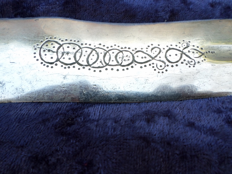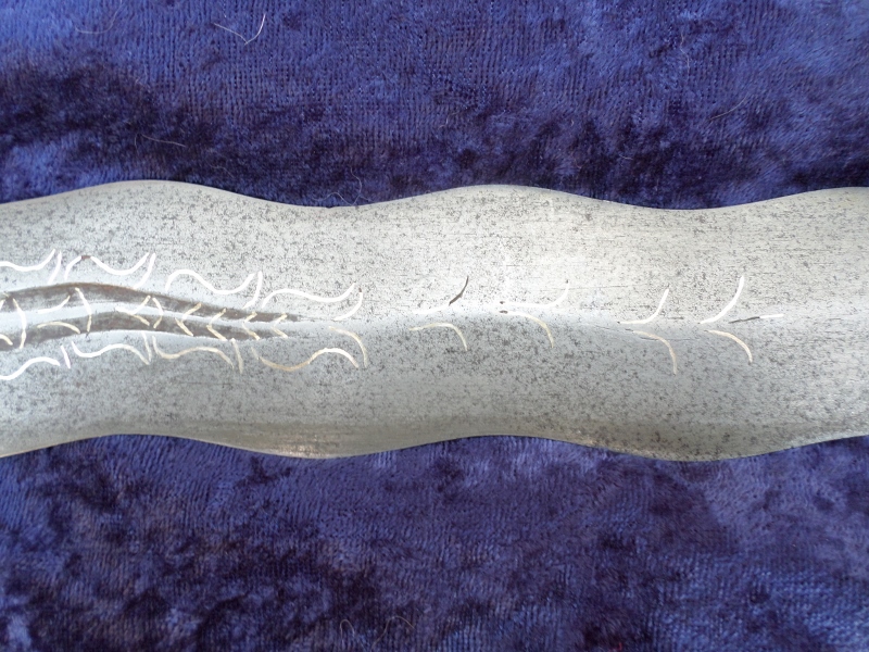 Here is a pair of moro krises for viewing. The top kris has a silver cockatoo with alternating bands of swaasa. The 22 inch blade is probably from the late 20s or early 30s as the ganja is one piece. Most of the silver inlay on the blade is intact. The bottom kris is an early 1900s piece with silver-banded handle and what looks to be the tip of an elephant tusk for a pommel. 23 inch laminated blade with some talismanic?? engraving. Looks to me that there was never any silver inlayed into the engraved circles.....Dave