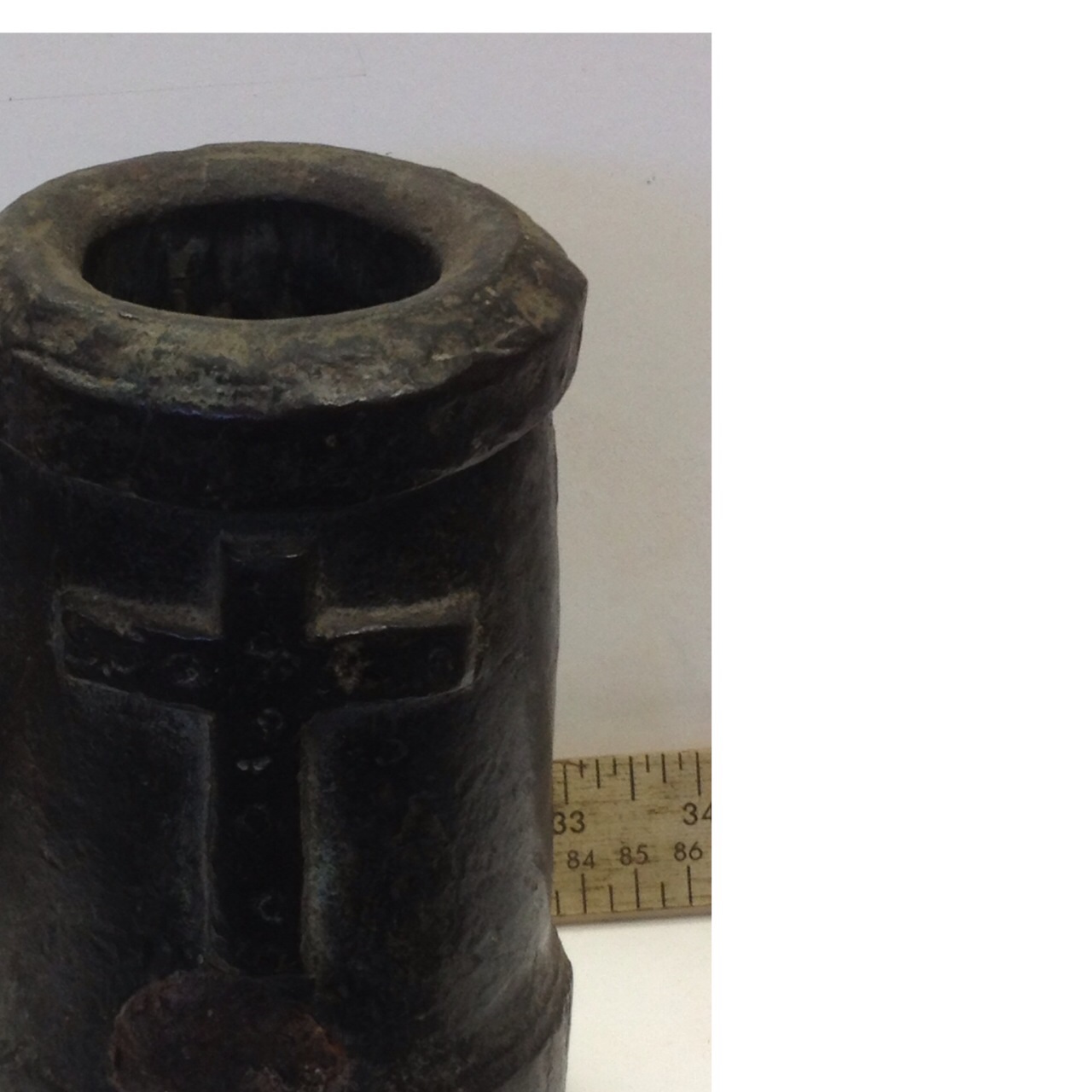 Some time back I picked this item up at an estate sale. The bore is roughly 2 inches in diameter. I included a ruler in the photo to give an overall idea of the scale. The bottom was filled with lead a long time ago up past the vent, which has been spiked by what appears to be a large headed iron nail!