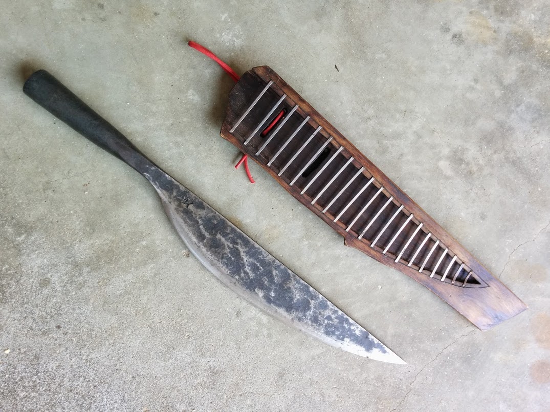 I have a nice old parang for sale, with the surface rust cleaned off, leaving patina. It has the curved geometry and chisel grind that is typical of these kinds of blades. Almost all in great condition but a bit of wood chipped off the handle, and a piece of rattan binding on the sheath is loose.