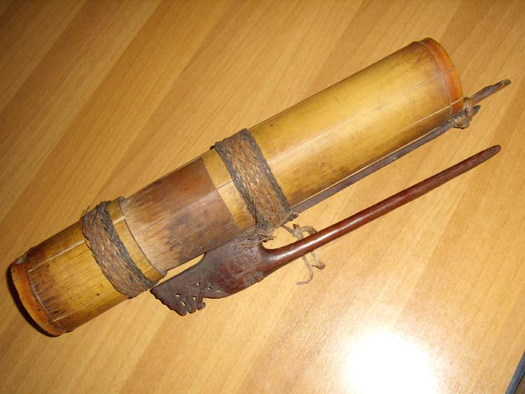 Tau't Bato tribe from the Philippines. In the top of the cover poison was poured to put the tip of the arrows in. The picture of the warrior with blowpipe and quiver is a member of the Tau't Bato tribe. |