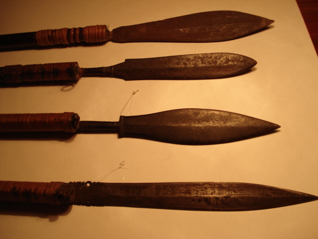 FROM THE PICTURE IT APPEARS THAT ONE BLADE HAS A PATTERN BUT I CAN'T TELL FOR SURE. THE OTHER BLADE IS A VERY UNUSUAL FORM I HAVE NOT SEEN BEFORE. I THINK THE LITTLE METAL PIECE STICKING UP OPPOSITE FROM THE BLADE IS USED FOR SIGHTING CORRECT ME IF I AM WRONG. THE ONES I SHOT IN BORNEO WITH THE PUNAN DID NOT HAVE BLADES OR SIGHTS SO I HAVE NEVER USED ONE WITH A SIGHT BEFORE. I HAVE USED A MODERN METAL VERSION OF THE JIVARO BLOWGUN FOR HUNTING SMALL CRITTERS IN THE PAST ,I GOT IT IN THE 1960'S AND IT IS QUITE ACCURATE BUT HAS NO SIGHT. I WAS LOOKING AT THE PICTURE OF THE HUNTER I POSTED ABOVE AND I MAY HAVE BEEN WRONG SAYING IT WAS A PIG AS IT ALSO RESEMBLES A SMALL TYPE OF JUNGLE DEER FOUND IN SOME AREAS.