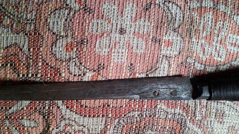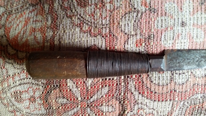 Here we have a Berber knife much like a miniature flyssa! When I first purchased this quite a few years ago, I thought it might have been a Native American knife due to the fish motif on the blade accompanied by the wire grip wrap so similar to that found on scalping knives. This is actually a very cool piece and would look great with an accompanying large flyssa. The grip is the classic octagon shape, wire grip all tight and intact. Blade possibly made from a file with arrow and fish(?) shapes. Fish have brass dot eyes. Blade is 7 1/2", total length 11 1/2".