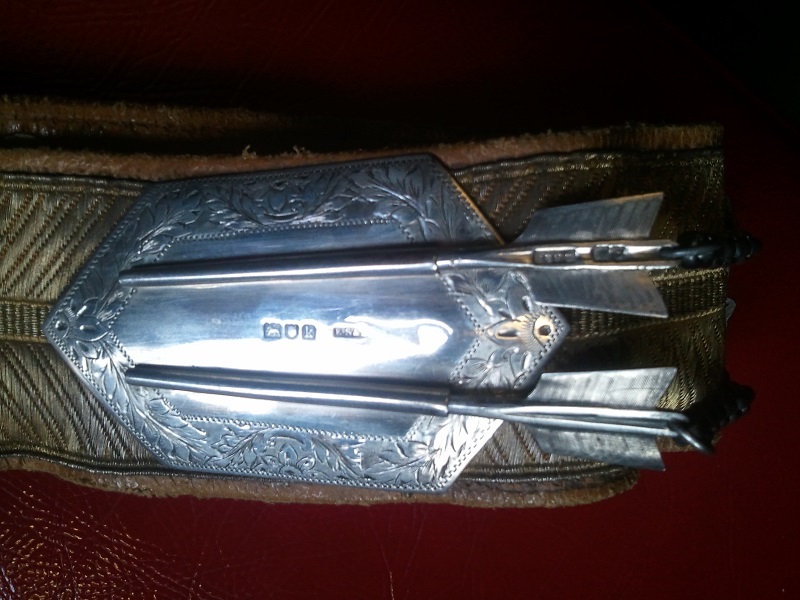 The crossbelt has a Kings Crown cypher and refers to George V as has been observed above , and the pouch itself is has a Queen Victoria cypher . The hallmarks cannot therefore be as early as has been stated . The original purpose of the arrow shaped prickers was to jam into the vents of enemy guns in order to 'spike' them ie render them useless for the duration of the battle. They were originally carried by officers of Light Cavalry regiments for this purpose and the later silver versions were a symbolic reference to this once vital function.
