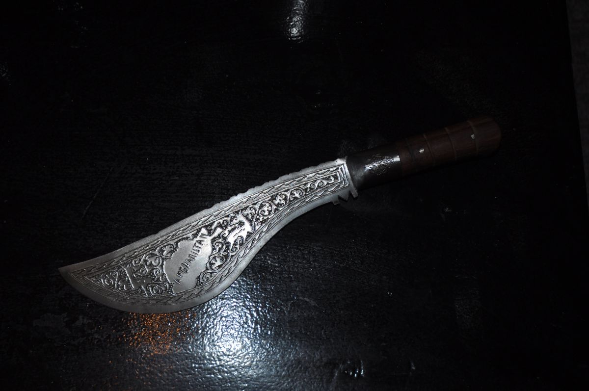 I know nothing about provenance, but I do know that the owner was ex-Canadian Forces, served in Afghanistan, and is currently under full-time physician care. My desire is to preserve this item, document it, and perhaps learn interesting things in the process. In a perfect world the ex-serviceman might want it back someday, and if your forum members could help, perhaps that could happen with an enhanced appreciation of the souvenir that he brought home...and then intentionally left behind. The piece? - it's hefty and solid (475 grams) - full tang, wooden handle - the engraving is asymmetrical - the map of Afghanistan shows some interesting boundary issues - the deer engraving is interesting in that the deer lack antlers (presumably a musk deer that was thought to have become extinct circa 1948?) Restoration work? - I wished I'd photographed it in situ. It was rusted and looked like junk. - Only treatment so far has been WD-40 and elbow-grease. I'll try to make some better images as the quality of the engraving is really nice. Sorry for my long-winded email, but I was dumbfounded when I couldn't find anything even remotely similar in blade-shape, construction or finishing. Best wishes from Canada, Andrew |