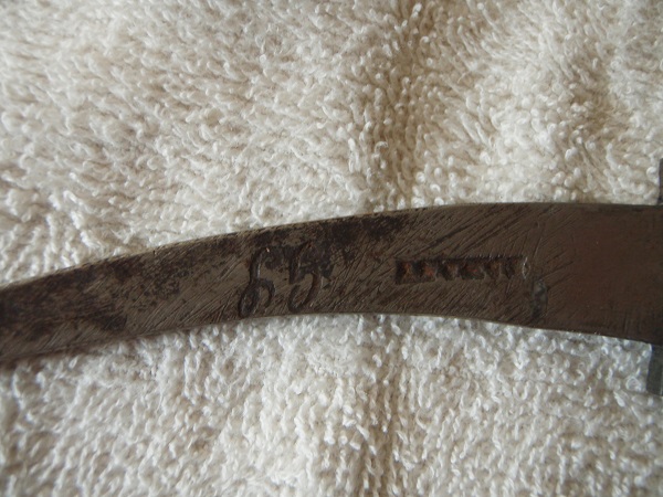 The absence of a prominent single fuller with engraved vines and leaves is important, and we do not see the place name (or its abbreviated form) inscribed at forte along with the year of manufacture. The marks on the tang are also atypical and appear to have been stamped, whereas the marks on Tjike blades are all chiseled and scribed.