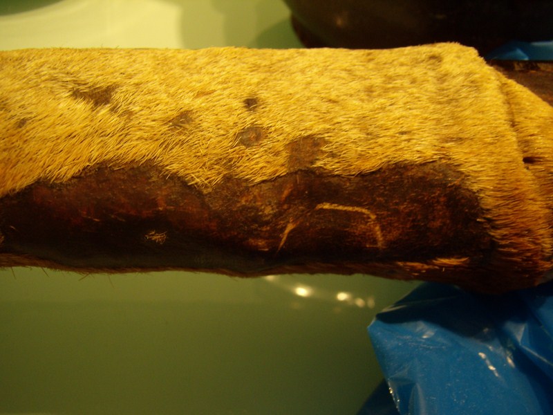 Interesting Matchlock. It does look like the goatskin was being used as barrel bands, or possibly stock repairs (?). The leather bands would not surprise me. But the fact that the goat skin still has hair on it is surprising. Very neat!! Rick.