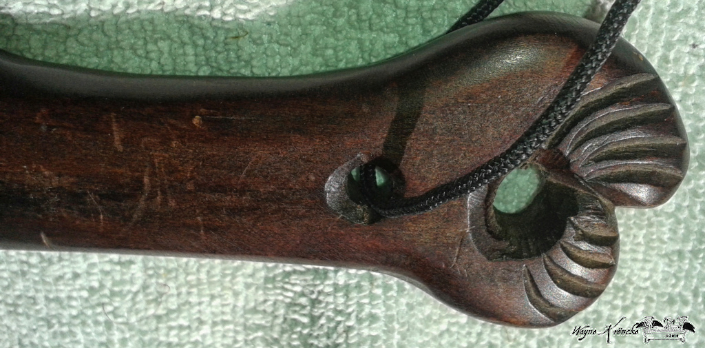arrived today from a UK dealer, maori shark toothed cutting impliment, kind of a utility knife used to slice meat and veg mostly, but also humans as the need arose. 6 shark teeth are from the 6 or 7 gilled sharks native to the NZ area. they are held together by some sort of fibre and resin in a groove in the wood, hard to see exactly. they are razor sharp too. this one is 23 cm. long. (black cord was added by me to hang it)