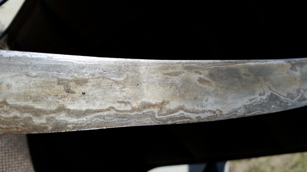 in my honest opinion, the blade is no modern fake, it is at least from the period of around WW I. I can see some pitting, which is not too easy to fake. The quality of the forging work seems pretty good, I cannot see any flaws, like open layers or so. The pattern welded blade is also not a roughly forged blade. If the blade would be polished up to a grit of 2000 oder better 3000 and etched with high detail etchant, you probably will see much more and much finer details than now. But the siganture, which was translated with "Assad Allah" is not real. Assad Allah was the most famous wootz blacksmith and this definitely no wootz. Roland |