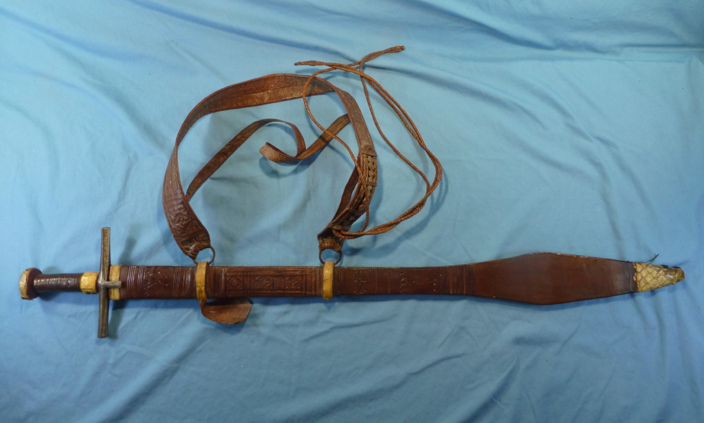 I just got in this kaskara and was impressed with how complex the harness is; there is both a broad and thin strap of about equals length and two pairs of braided cord coming out of the main strap. I know these were worn on the back. Does anyone have a picture of how these straps and cords were arranged?