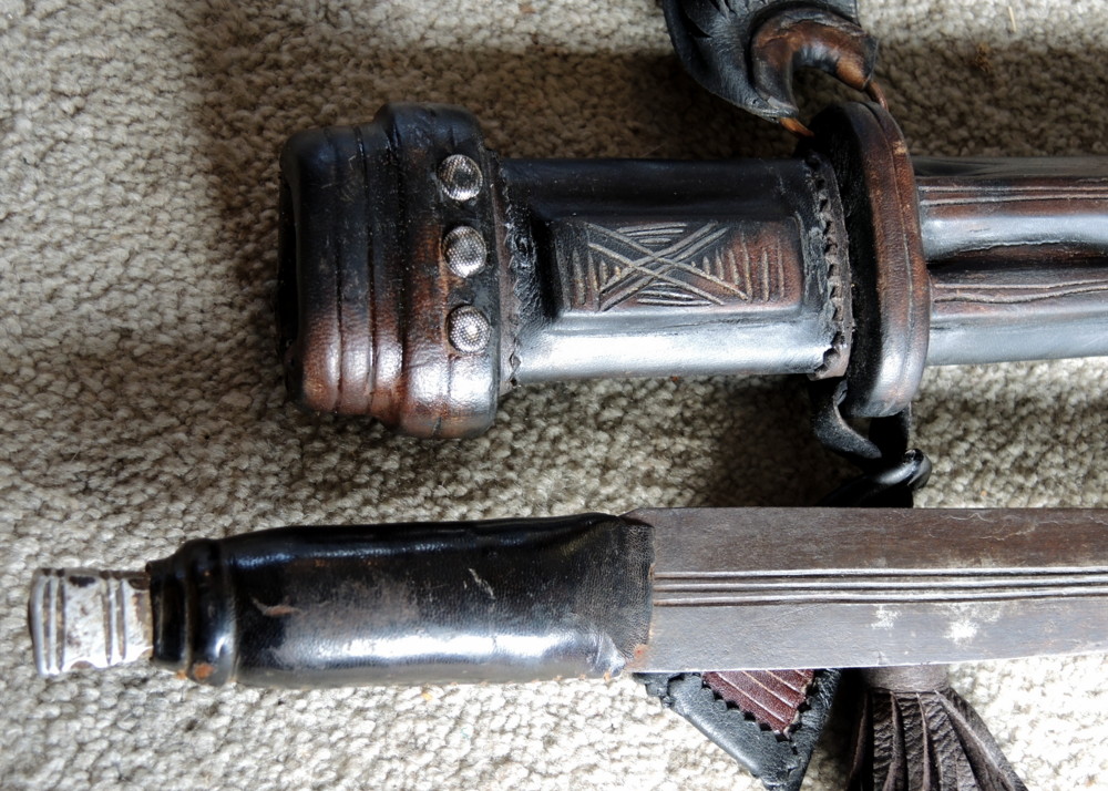 Another item out of my "comfort zone". I assume this is African also. The scabbard leather work is exceptionally good IMHO, both in quality and construction. The drag appears to be aluminium??? and the "peg" at the tip is copper.