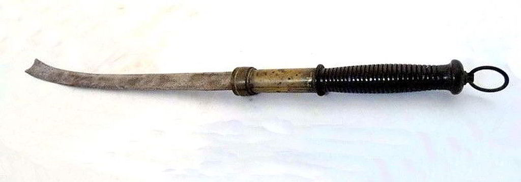 sword is well made, tight, the blade has been over-cleaned badly. there is a set of three recessed/stamped dots on one side about halfway down the blade, along with a fairly crisp curved wedge shape partial right at the grip junction. it looks like the blade may have ghosts of former scroll work and koftgari sadly 'cleaned' away,also . an 'eye' shaped area on one side may be part of the decor. blade looks shorter than it is in the photo due to being tilted with the tip further away. anyhow, sword is 33.5 in. overall, 578 grams, blade is 20.5 in. long, 1.25 in. wide, 5mm thick at the guard, distal tapered nicely. grip's sturdy brass section is 4in. long x 1 in. dia., ribbed and lacquered wood bit is 9 in. long. sword is tightly embedded in the exposed wood end of it. balance point is about 4 in. in front of the grip. feels good in the hand. sharp too, except the inside of the curve of the tip, which is not. suspension ring is split rather than solidly welded, and is free to flop about. Last edited by kronckew; 6th September 2017 at 10:55 AM. |