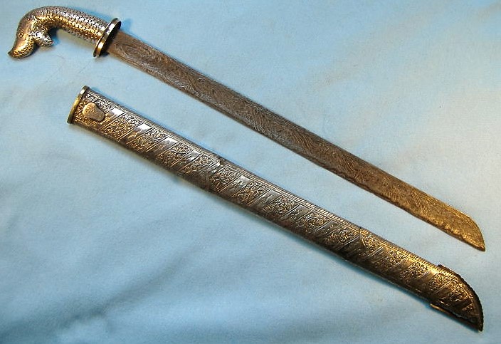 I can't help but wonder here if the blade is an older remount to later silver fittings. Does anyone have an idea of the age of the piece as it is now? Dimensions: Overall length: 27.5in. Blade length: 22in. Blade width at the center of the blade: 1.25in. |