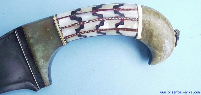 The second is the knives made in India during the late 19th and early 20th C aimed specifically at European markets and British people who liked to travel to exotic places. There is a particular style that stands out in this regard. The most common of these is a knife that has a curved blade of polished steel with "Pure Steel," "Victory," and occasionally "Kirpan" reverse-etched at the forte. The hilts comprise small plates of MOP with interspersed straight or zig-zag black lines made of jet. A brass guard, ferrule and pommel are present, with a brass chain often linking the pointed pommel to the cross guard. The hilt is of full tang construction, with a screw thread on the end of the tang that takes a nut to hold the hilt in place. These knives originally came in a red leather sheath with a brass chape and locket. In my experience the chape tends to get lost first and later the lockets. A less common variant of similar construction has a karud style blade of T-section, usually with a fuller, and a hilt of MOP with interspersed black jet, a brass ferrule and pommel, but no cross guard or chain; the hilt is again of full tang construction. I have shown a small sample of these in the pictures below. Despite being mainly "tourist" knives, they are generally well made and attractive knives. There are quite a few of them around, so they are neither rare nor particularly valuable. I think the karud style is less common, and indeed knives of this form seem to be offered for sale at quite a high price these days. The accompanying pictures illustrate the two styles and some of the marks found at forte. Close up views of the hilts show the MOP and jet construction. I would be interested to see any other variants of this genre that folks have found over the years. Ian. Last edited by Ian; 4th January 2018 at 08:47 AM. |