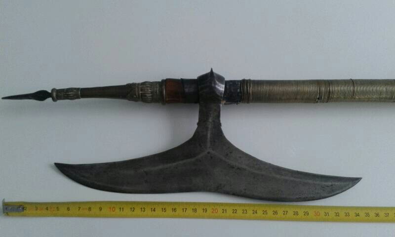 Very good bullowa axe,lenght 99cm,blade 30,5cm.Brass fittings and wire.Blade has some movement,still sharp. Original condition.Hardwood shaft, no cracks.Asking price 225€.