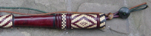 These two weapons clearly come from the same region. The bulbous leather covered pommel quite different from those that end with small brass or aluminium knob. Thinking about the small weapon and fantasy fighting with it. I have changed my mind about its effectiveness. Held in a basic hammer hold with the blade up or down facing, at close quarters and thumping with the pommel it could be a very aggresive weapon. Also very pretty.