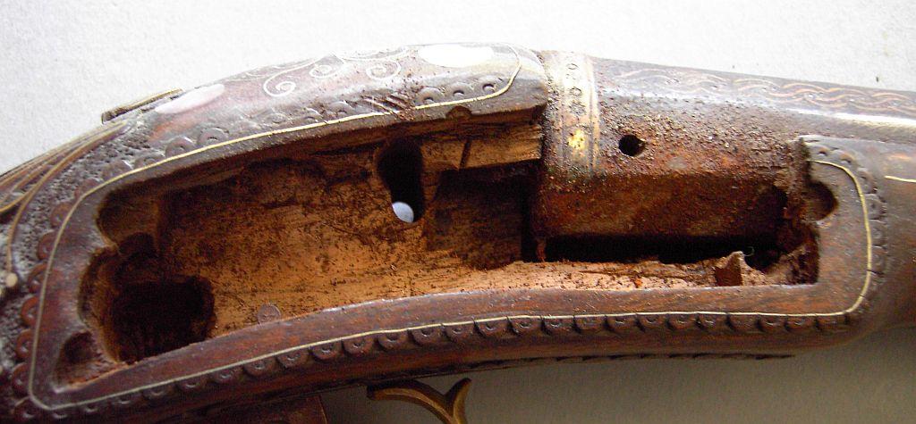 I post this one only to note the decorative filework on the edge of the frizzen spring, in comparison to that on the pistol under consideration.