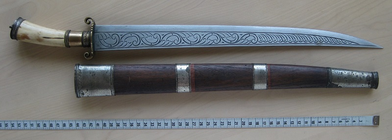 I agree with Battara. This looks like a Maranao creation from the late 20th C. The blade form is not a common traditional Moro shape, and follows more of a Western pattern. The "curls" on each end of the guard are typical Maranao work of the last 60 years or so, usually seen on gunong that have been described as sarimanok. I've attached pictures of a couple of examples of sarimanok gunong. These are older than your sword, but they have low quality blades and are essentially decorative items. Ian. . |