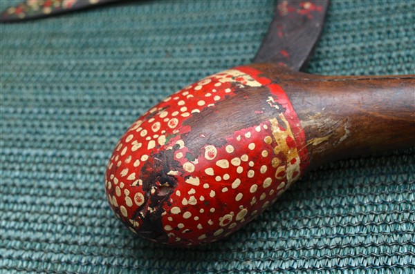 The other ax is very substantial with a large heavy blade that measures 13.5" x 3.25"(the actual crescent part of the blade). It would be for cleaving and strangely enough, judging by its balance, possibly for throwing, as both the inner and outer edges are sharp. I can not find another one exactly like it, but what is driving me crazy is the paint job that makes it look like a Christmas Tree Ornament! Was it decorated that way for a wedding, a funeral, or an initiation ceremony or did some dummy think it was a good idea before he passed out drunk? I am unable to find a similarly painted ax; has anyone else? |