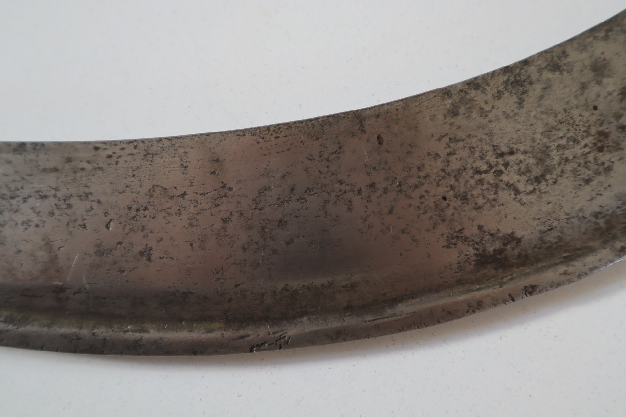 Here is a rare South Indian Chopper, or so called malabar axe. That "sacrificial" sword is 54cm in total length, made from forge folded steel. Really heavy in hand, and still sharp. I actually have difficulties to date that piece, but i believe the blade to be 18th and the carved horn handle from the 19th century. The carving in the handle and at the end of the handle (brass piece) are really crips and nicely done. Ask 450e including shipping (international) Don't hesitate to ask for more pictures. Julien |