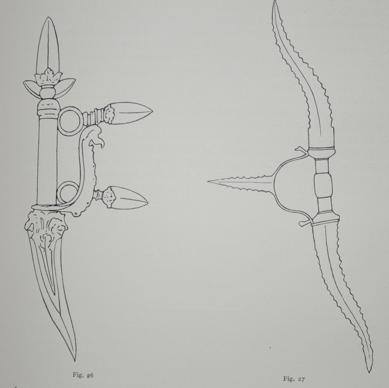 HALADIE. A Rajput double dagger with two short, curved blades fastened to the opposite ends of a straight handle. (Egerton 390). A similar weapon is still used in Syria (Fig. 342)