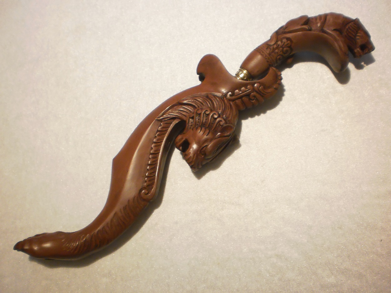 I received this Kujang, your comments are welcome. The handle is carved in the shape of a tiger, the scabbard is decorated with a tiger's head and a paw as tip. The blade shows a nice pamor pattern. dimensions: total 45.5cm; without scabbard 36.5cm; blade 22.5cm I have some questions about it: - How old could it be? I think it is not very old, but I'm not sure. - Was this weapon only used by the Sundanese people? - My Kujang blade has 7 holes. In this thread I can read that this refers to the seventh month of pregnancy: http://www.vikingsword.com/vb/showth...ghlight=kujang Is this right or are there other possible interpretations? pictures: |