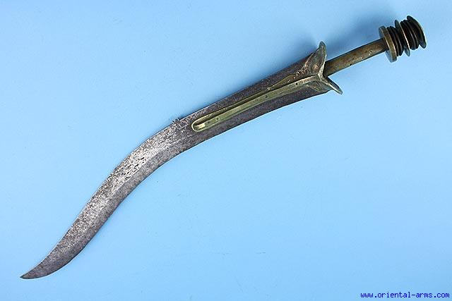 I have a British sword circa 1815 with a recurved blade, similar to this one. My blade is a pipe-back and is 80cm long. The intent of the design seems to be to provide a curved cutting edge, with the point more inline for easier thrusting. Initially I had thought that perhaps the officer commissioned this sword based on similar blades he had seen in India, but until now hadn't seen any similar blades. In most sossun patahs, the final curve which brings the point back up is much shorter and the point is nowhere near inline with the hilt. Thanks for posting this. Cheers, Bryce |
