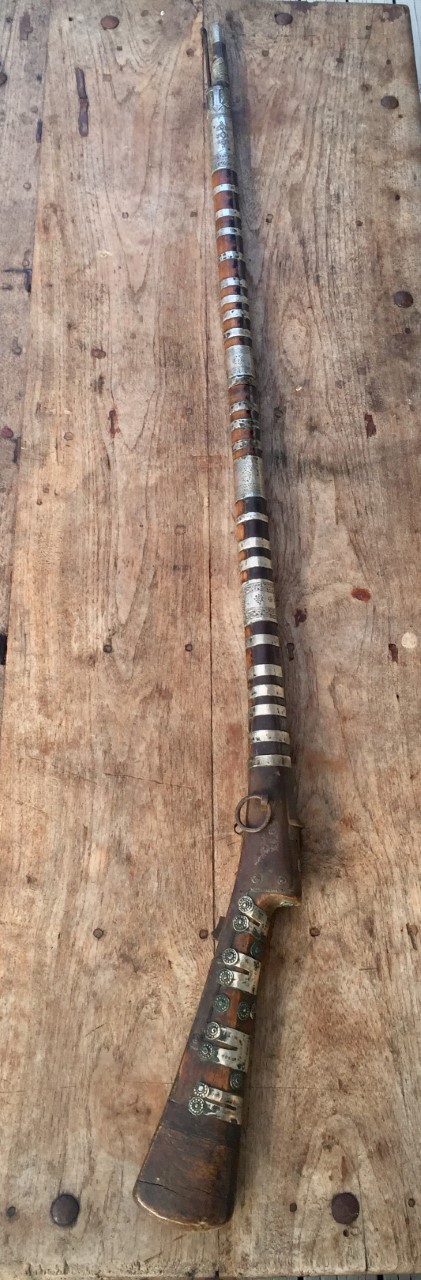 I AGREE WITH KUBUR ,THIS IS FROM NORTH MALABAR/COORG REGION ,NICELY DECORATED,THE BUTT STOCK HAS ARAB ADDITIONS ,TRADE GUNS