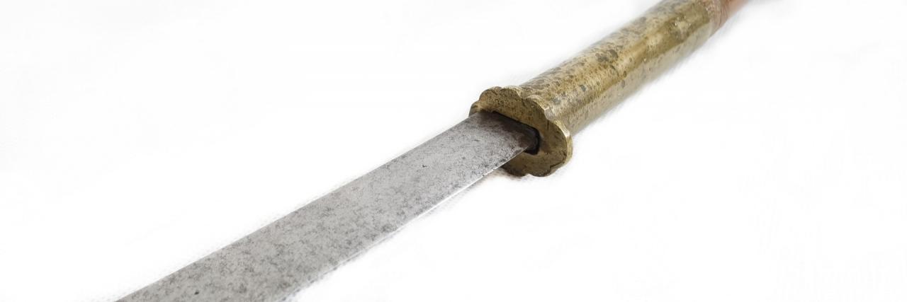 A nice complete montagnard dha for sale with the scabbard, these aren't common on the market, particularly with the scabbard. It has a nice bronze collar and guard and quite long handle.