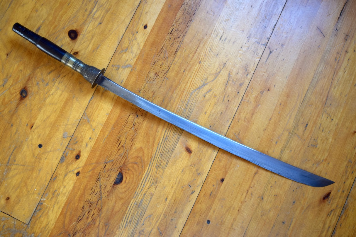 The difference between older swords like this and later examples is quite marked when you have handled a few. While the handle is fairly long it is very comfortable single handed held right behind the guard with a beautiful balance. The blade is notably better than most and was still extremely sharp. Nothing fancy about this sword, but I have always preferred the old warriors over the more decorative examples. |