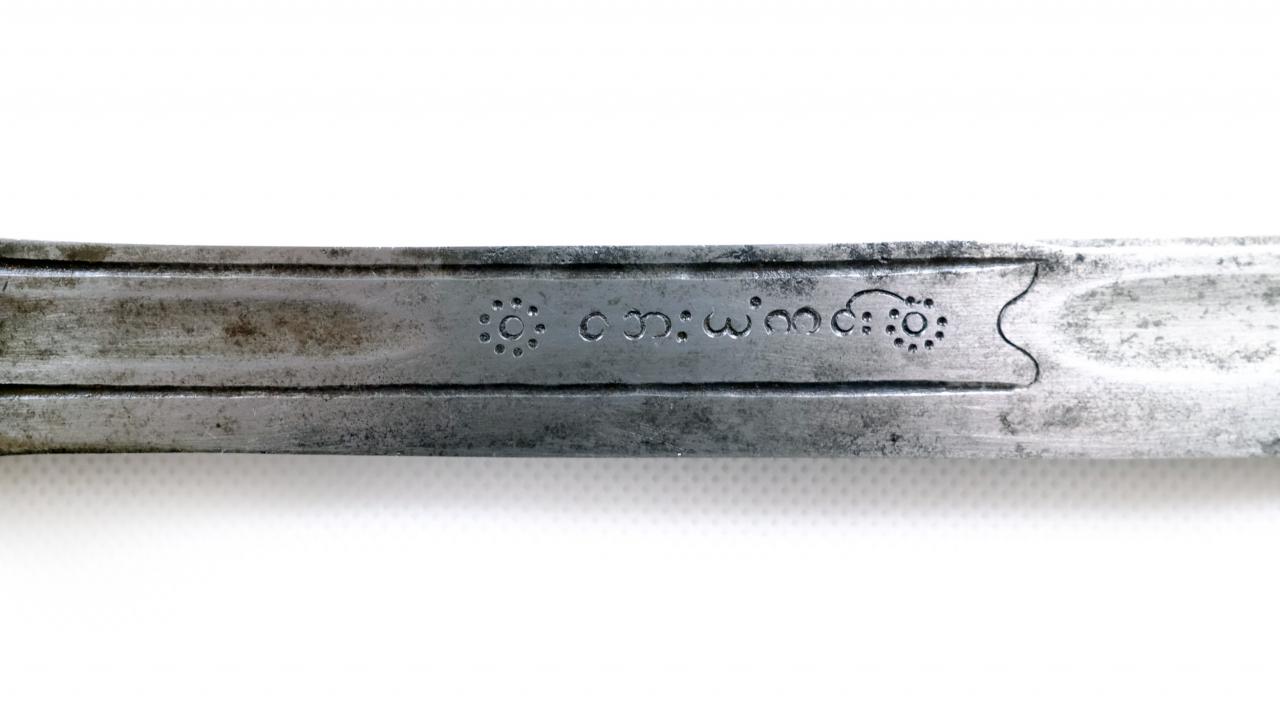 A very nice Burmese dha I am releasing from my collection with the inscription (ဘေးယံကင်း = "Safe" and on the reverse ယံရှင်းဓား = "A sword to remove strife/danger"). Very nice piece, handle is beautiful with decorated brass/copper fittings and bamboo root handle.