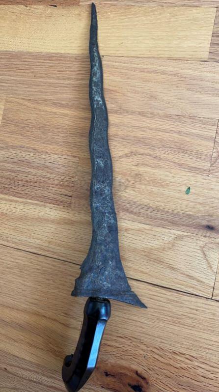 It has been slow in the keris sub-forum lately so I thought I might ask some questions without diluting the quality of the discourse. I bought this "keris," I believe it to be a keris not a keris like object (question 1), some time back as a project piece to learn skills with, such as cleaning and staining. Handle removal is an unforeseen bonus skill. It remains to be seen if it is attached with resin, rust or epoxy. It seems too soft to be epoxy. When I bought it I thought it was a Javanese keris placed a Sumatran Bugis influenced sheath (the fit isn't great). I took it out a while back to decide if the blade could withstand the cleaning and staining process and noticed that the blade was very flat and thought, "this is a Bugis characteristic." It is a very worn blade, was it forged with the flat of the blade being flat and not lenticular or did this happen due to time and erosion through cleaning, staining, and neglect cycles? Could it be a newish blade dipped in an aging chemical bath? ( I guess a sub-question of question 2) It is lacking a mendak and I began to wonder "Is this a Bugis style blade and wrangka with a Surakarta ukiran?" (question 2) Though the blade is 9 luk I have atached a picture from Tammens' De Kris vol. 1 of a 13 luk blade in which the luks have a similar profile and shape to my eye. The bells and whistles on the two gandiks are very different. Finally concerning the blade the I believe what I have seen called buntut of the ganja is split. Is this by design? If so what is it called, or is it just a failure of a weld? (question 3)