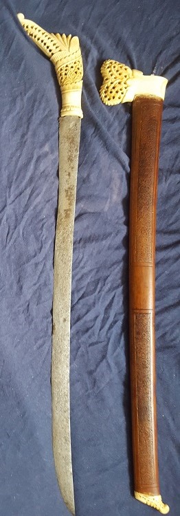 Amongst it was a yataghan....according to the seller. No way a yataghan was my immediate thought; rather Asian and more than likely from Indonesia. Not being an expert on Indonesian cold arms, I consulted a Tuan who is most knowledgeable and confirmed my thoughts. It looks like a Sewar from Sumatra ( like the 3rd one by Albert van Zonneveld ) but the size is quite long : total 70 cm scabbard 57 cm (wooden part 50 1/2 cm) hilt made from ivory 14 cm blade 50 cm and quite heavy your thoughts and advice please...what is this and how old do you think it to be? |