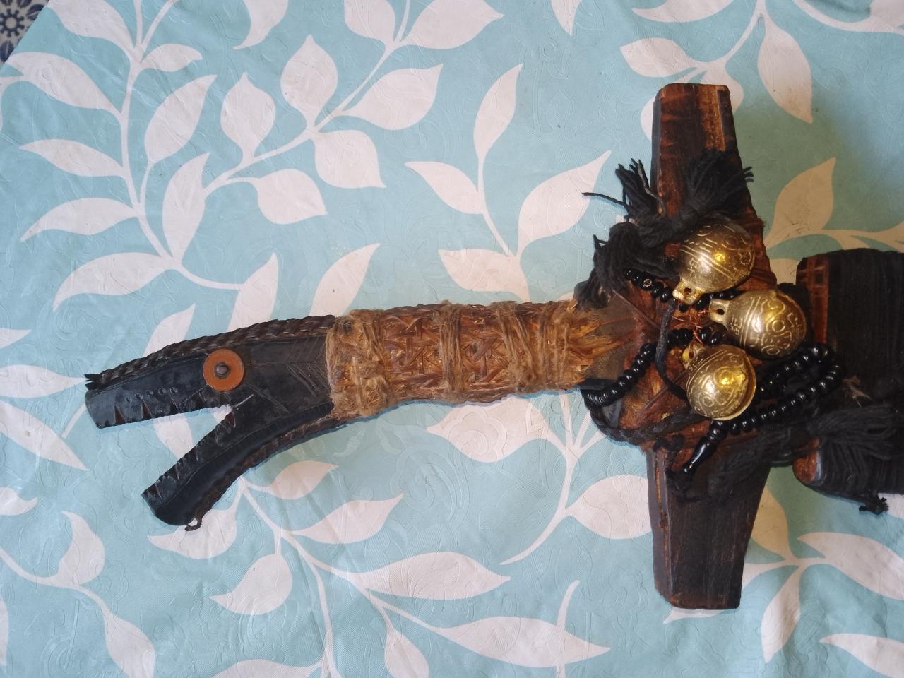 A gift from my father on my promotion! ha ha ![]() The seller (from Lanao-Mindanao), claims it to be a lumad blade (Higaonon Tribe, Bukidnon). The hilt's design, as I look at it, looks more like an open-jawed naga/serpent, rather than the designs on my other kampilans(moro) which has a distinct 'crocodile open-jawed' profile. Any input/s opinion/s appreciated. ![]() Enjoy, Yves Notes: 1) the hilt is carved from carabao horn. 2) there's a bronze filling along the blade (is this some sort of a talisman or something). 3) with black beads on the hand guard 4) old brass bells attached |