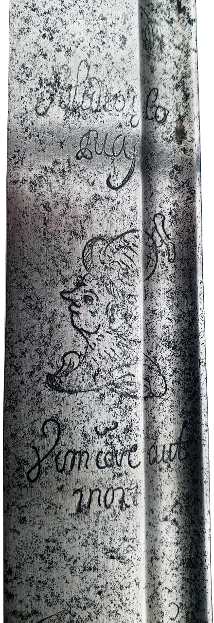 I recently acquired this Swiss Horseman’s sabre with an Iron hilt, and another described as a German Campaign sword with a brass pommel and guard. I have been trying to find a more definitive description for these to basically label and file them etc. I have attempted to translate pages 167 to 170 of SEITZ Heribert - Blankwaffen 2. This chapter deals with “The Warguard” and from the illustrations appears to apply to this group of swords. I am pretty comfortable with the dating of these but their origin and correct reference name still illudes me. The translation from German to English reads as best I can tell: “THE WARGUARD In the dense flora of the long sidearms of the Baroque era, a characteristic group of cutting weapons stands out, characterized by their slightly curved blades, which are single-edged, and by their hilts in the shape of epee hilts. The group is most influential in the second quarter of the seventeenth century and, with a few exceptions, is fairly uniform. The weapons belonging to this category can most likely be counted among the "German-made sabers", as they were called at the time (I, p. 183, 359). As an exception, a powerful weapon with a leather-covered, long wooden grip can be mentioned. (Fig. 179) This unusual type probably once belonged to the hand weapons on a warship, where a weapon of this shape (the blade is 88 cm long in this case) was used for boarding or even for the defense of the vessel is reminiscent of the Dutch type that was in use in Sweden from about 1625 to 1640. However, the main part of this group consists of cavalry weapons with conventional construction. The hilt here has both knuckles and side knuckles (see Fig. 9) and an openwork guard plate that often curves upwards (Fig. 180). For a reason that is difficult to explain, this weapon has sometimes been called the "Swedish saber" - however, neither the type nor the designation could be attested in this country. Curved blades were not used at all by the Swedes at that time. Although this type of weapon may have happened to have been used by Swedes at some point, e.g., B. in the Thirty Years' War (of which nothing is known), one obviously has to look for its origin in a completely different area, most likely in southern Germany, Austria and Switzerland. The knob has a flat, heart-shaped shape, like that found in the Netherlands and Sweden (cf. fig. 180), but the squat, round knob is also common (fig. 180 right, 181, 182 right). The latter, incidentally, seems to have appeared at a later date than the former, since it can usually be traced with a decoration of two knob-like swellings nested within each other, this decoration of brackets occurring about 1640-1650 (Fig. 40). Any additional information would be more than welcome at this stage. The first sword is Circa 1640-60 Iron Animal head pommel with pieced guard on one side and thumb ring on the other. The blade is slightly curved 34” 86.5 cm long and has an etching of a man’s head with some text in what could be Latin above and below. If any one can tell what this is I would also be most appreciative. I have gone through all of my references on marks and blade engravings and found nothing that matches this one. Cheers Cathey |