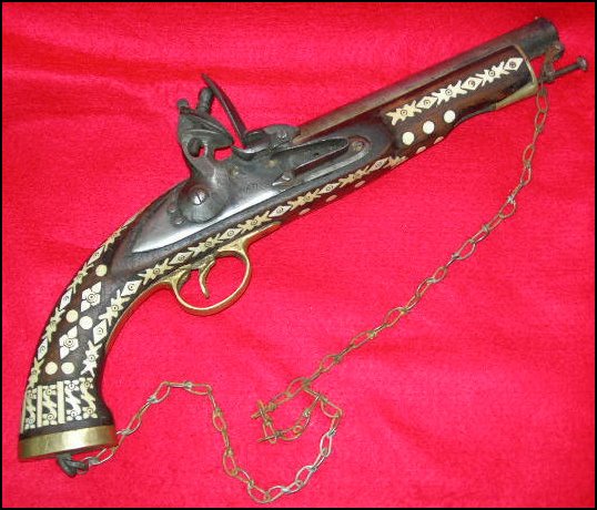 No, I don't have an original Afghan decorated East India type pistol, but wish I did. It's one of the few guns I don't have. And I've never seen one come up for sale that wasn't a Tourist item, or a Kyber Pass replica as mentioned above. I would even like to have a good Kyber Pass replica that I could re-work into a shooter. Like the first one posted above. Some comments on both pistols above:First Pistol: Note that both the trigger and trigger guard are unfinished brass castings that are not polished out and still show their casting seams. Also from the photo of the muzzle end, the barrel looks like a piece of thick pipe with the edges crudely filed smooth. Not made like a tapered gun barrel. Still, a nice Kyber made replica. Wish I had seen it. Second Pistol: Again, the crude trigger and unfinished trigger guard. Note also the hammer, frizzen, and frizzen spring attached with nails/pins versus screws. Rick. |