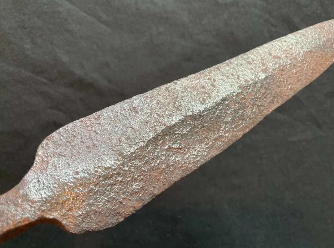 Tonight I purchased this spearhead from fellow forum member RSword. It was described as possibly being of European origin in the description. It appears to be quite old and was described as potentially being 1000 to 2000 years old. The only comparable object, in terms of age, in my collection is my 17th century (probably) Italian dagger. So it could be that old at least. I do have two other items that are much older (a piece of petrified wood from Arizona and a small meteorite I found when I was a kid) but they are neither arms nor armor so I will keep them out of this discussion. Being a tanged spearhead could set the date of origin for this piece quite far back. My knowledge of ancient European spearheads is close to nonexistent, but I do know that tanged spearheads in Europe went out of vogue at some point during the Bronze age. I thought about points of origin outside of Europe but this head doesn't appear to be from any sources I could think of. Bronze age spearheads from Luristan were tanged and obviously bronze, but my head is iron/steel (RSword magnet tested it). There are iron weapons from Luristan but they are all far more corroded compared to my head. The total length is 17 inches and it is 2 inches wide at the shoulders above the tang.