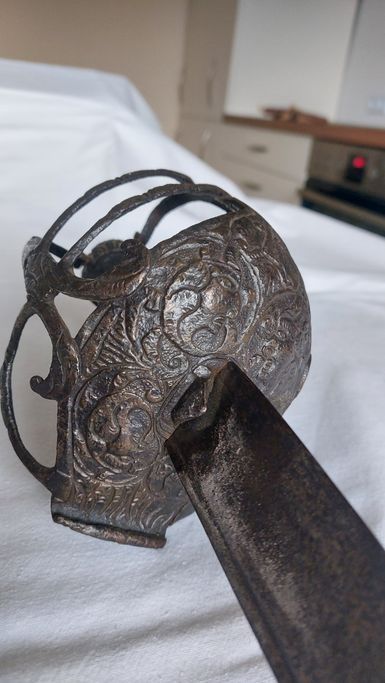 This sword was untouched for many years in an old weapons collection, which is why both the blade and the handle have a dark patina. Unfortunately the blade has scars along its entire length. the handle is covered with leather. The hand guard is made of very beautiful iron cut work; you can see masks and tendrils on it. The total length of the sword is 100cm. the blade length is 88.5 cm. blade width 3 cm. If you still have any questions, or you need more pictures so please let me know it. The postage costs depend on the buyer's place of residence. Price: 2.750 € |