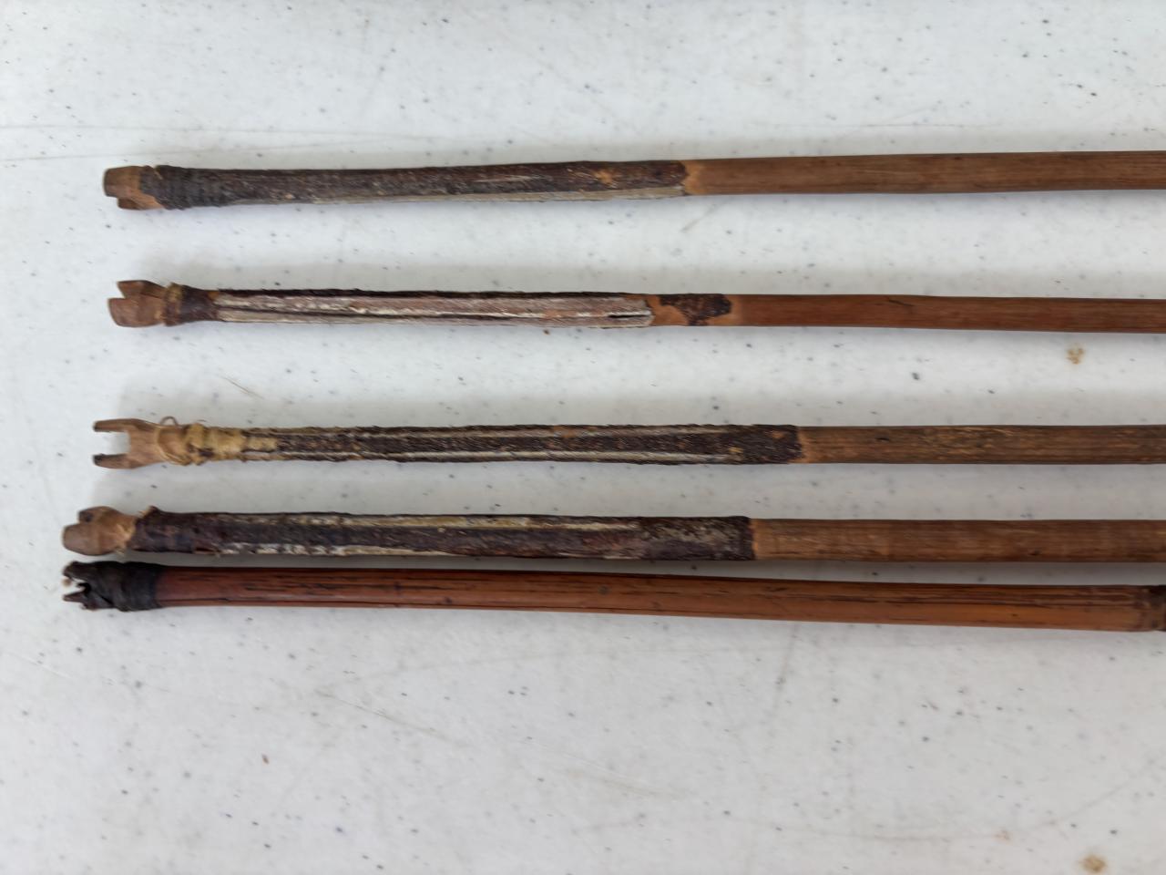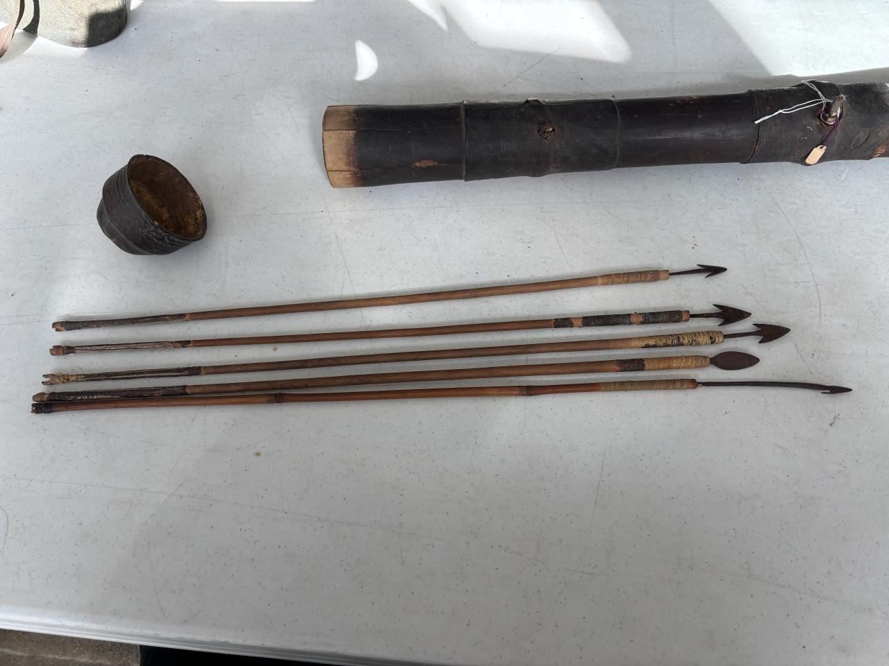 I have some (minimal) experience with weaponry, and with the assistance of some other experts - and his own posts on this forum! - I have finished cataloguing all of shakethetrees' guns, swords, militaria and ethnographic items except for a small handful that have eluded me. I decided to bring this full circle (as it were) and post these items here as he might have done for input (though without, I readily admit, his insight or expertise). The first of these items is a quiver with arrows, which I think is Somali or Ethiopan. The wood quiver is bound and capped with leather, l. 26", and has five arrows, l. 20-3/4" to 23-1/4", three with two barbs, one with one barb, and one leaf-shaped. I would appreciate any and all opinions as to origin and age. |