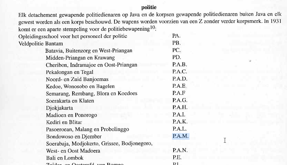 The P.A.M. on the messing plate is for a klewang belonging to the Field-police of Bondowoso and Djember (note: This is Dutch spelling used in 1935 so it maybe named different now) the number is the weapon number within that unit. As far as I know this information is in Dutch only. In a later post I will try to translate it.