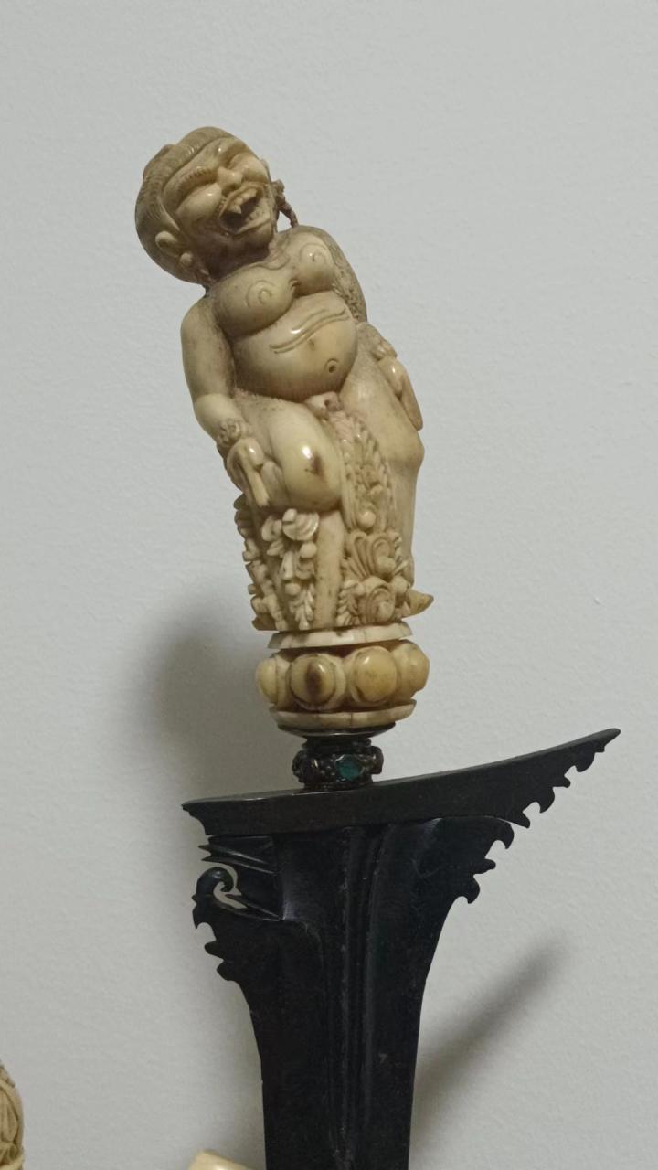 the quick answer would be - because of my personal taste. The somewhat longer one - I doubt, somebody interested primarily in Bali, how it was before 1908, when the order changed, would like this kind of ivory crosspiece carving. If somebody, who has visited Bali in recent times, would have chance to visit Bali around 1900, he most probably would be astonished, how much of "traditional" Bali is missing - music, dances, stone and wood carvings. All of this did exist back in this time of course, yet in a completely different style and with completely different expression. On the other hand, this style of crosspiece carving is a genuine part of Balinese art of, let's say, 1950 - 1965, as such it is completely acceptable and genuine. It is kind of "aristocratic" version of the dancer's Keris. http://www.vikingsword.com/vb/showth...ht=dance+keris For anybody interested in changes of Balinese society and art during the XX century, I recommend the book by Hildred Geertz, "The Life of a Balinese Temple. Artistry, Imagination, and history in a Peasant Village". |