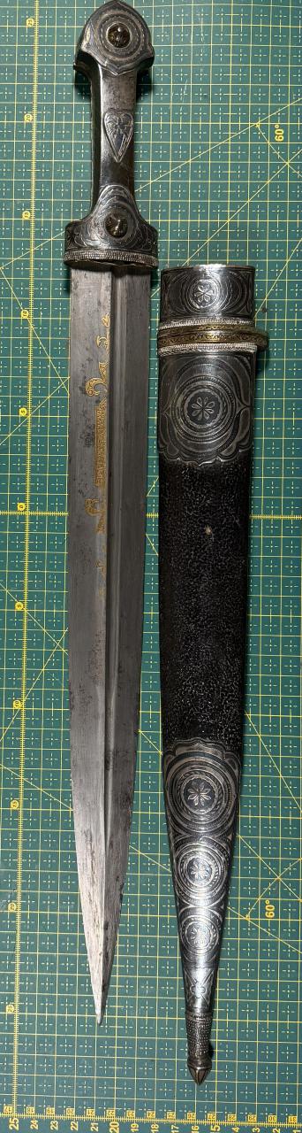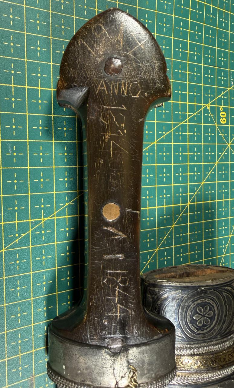I wonder whether you could give your opinion on the kindjal in the attached photos (approx age? Origin?) And furthermore, there are a number of dates on the gripshell (ANNO 1914, 1814, 1844 (all written with large script) and 1868 (somewhat smaller script). In addition, there seems to be illegible text along the rims. What would the dates mean? best regards Ole |