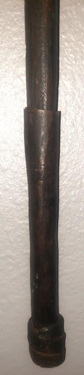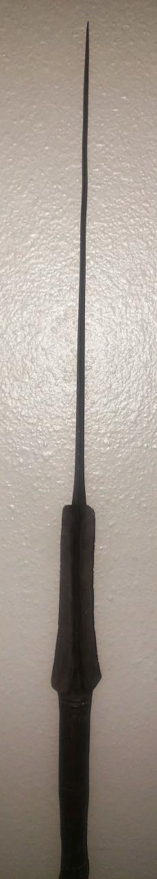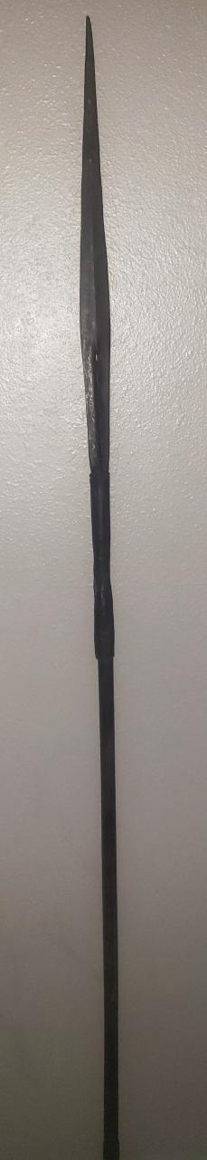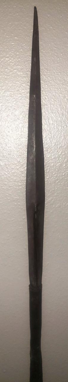 This spear appears to be African but I have not been able to identify the regional/ethnic attribution. It is 163cm (~64.25 inches) in overall length and has a distinctive point/blade with elevated fin-like midribs for at least the first 1/3 length of the blade. This feature gives the blade an X-shaped cross-section where it occurs, hopefully it comes across clearly in the photographs. Aside from this, the butt end is covered in an iron sleeve terminating in a thick iron coil. Any help identifying a more specific attribution would be appreciated.