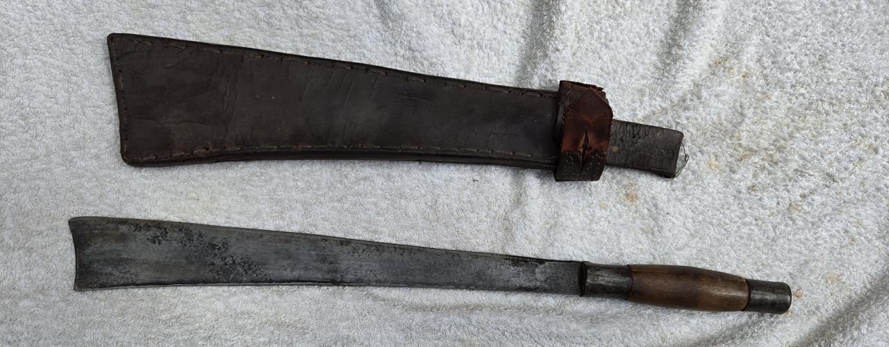 I’m looking to verify if the dha I picked up many years ago at an antique store is of the type used by the British Indian Army in WW2. Or whether it’s simply a roughly made souvenir with an old genuine scabbard. I picked it up because my grandfather spent time in Burma with the Indian 19th division during the war and my Dad said this dha “looked” like the tools his Dad had described to him. Those I have seen listed as British army issue WW2 Dias have obvious markings (e.g. broad arrow) and dates of manufacture. They have different “slab” and rivet handles. I have seen these referred to as Mk II or III and usually dated 1944 or 45. As seen in the photos mine is quite crudely made and has: Barely legible markings on the scabbard: “MP” ?, “8”? , “78”?. And on the spine of the blade: “1466” ? There are no obvious dates or broad arrow marks on the blade. Dad said the blades were often made of spring steel and mine looks pretty crude and agricultural. The closure on the scabbard has been repaired recently - but the style looks similar to later war British issue. Asking any members with knowledge of the subject whether the dha in the photos is simply a rough agricultural tool or whether it resembles anything that would have been used by British Indian forces in the Second World War. Thanks in advance. |