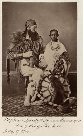 Jim, is the shield made of leather or of sheet metal (later they were also made of metal)? What material is the metal decoration made from? Your shield—and its age—would probably be best evaluated by Ron, who is an expert in this field. I myself think it is a "dress" shield from around the first third of the 20th century. For example, shields from the period of the Battle of Magdala (1868) had different metal elements (see the photo of Captain Speedy and Prince Alemayehu), and it is probably not from the turn of the century either, though I may be mistaken. I’m attaching several old images. In one of them is the old Ras Nasibu (on foot with a spear and shield in hand). Unfortunately, those photos are not dated.