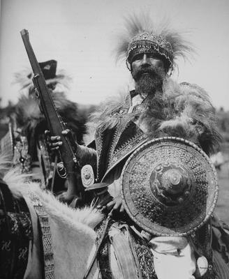 Another highly prestigious military figure below the Dejazmach was the so-called Fitawrari, who was also required to have a sturdy round shield decorated with metal (perhaps no longer with silver?; but the decoration on his shield was reportedly considered a necessity).