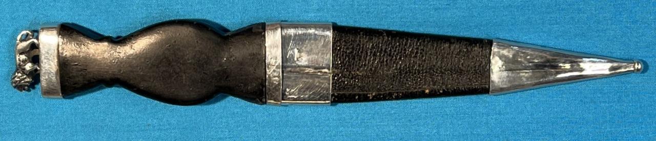Up for sale is this sgian dubh. The mounts are sterling silver (including the silver lion on top) and the hilt is made of ebony wood. The scabbard is made of wood and leather. Blade is stainless steel. This piece has been restored and has been used but is in good condition. Silver hallmarks are ".925", sterling silver.