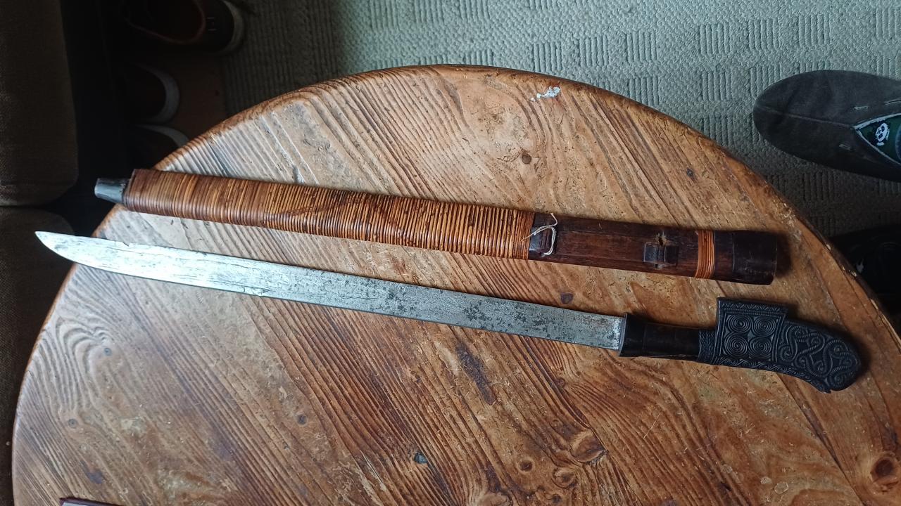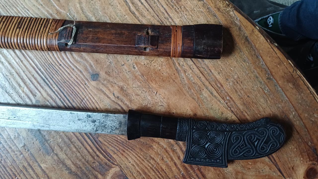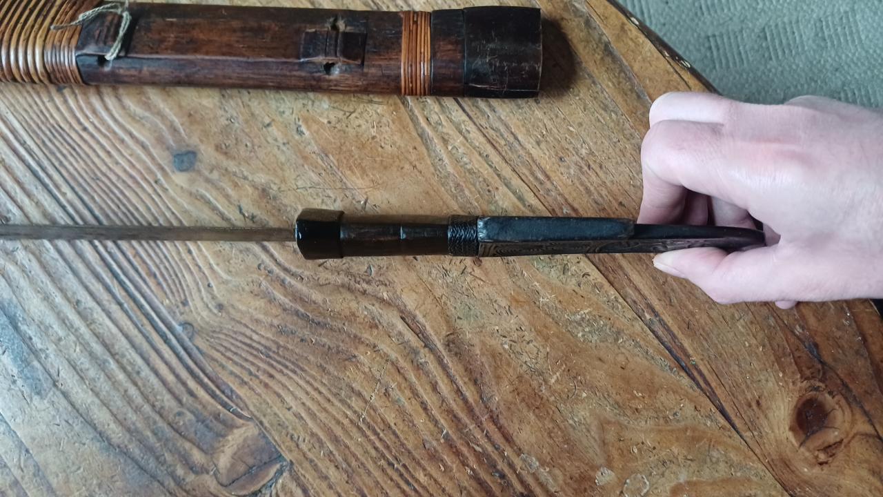 The second has a pretty buffalo horn handle inlaid with bone, unfortunately it lacks the rattan on the grip and mice we seemed to find it to their taste ... The foot of the scabbard is in buffalo horn and is maintained by a bone pin.
