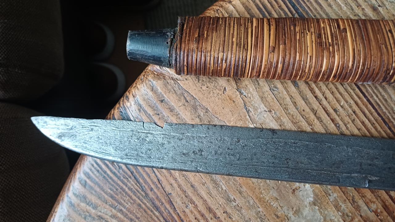 Unfortunately the scabbard is missing the foot and has some damage to the rattan, and there is a substantial chip in the blade. But I really like the grip carvings (with little brass inlays on one side) and the visible laminated blade structure. I was surprised at how thin that grip is.