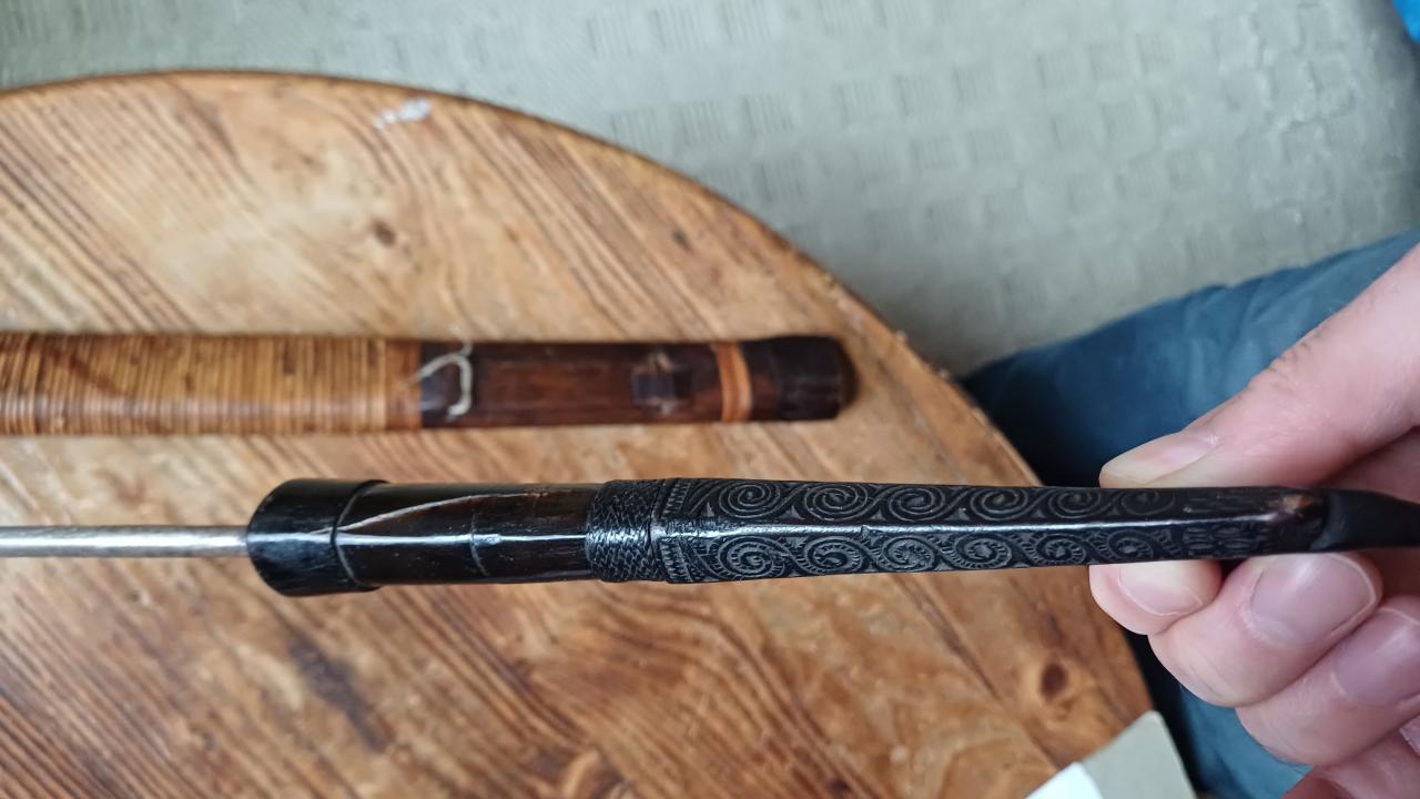 The first has a very simple wooden handle, the scabbard is covered with rattan with a brass band at the base.