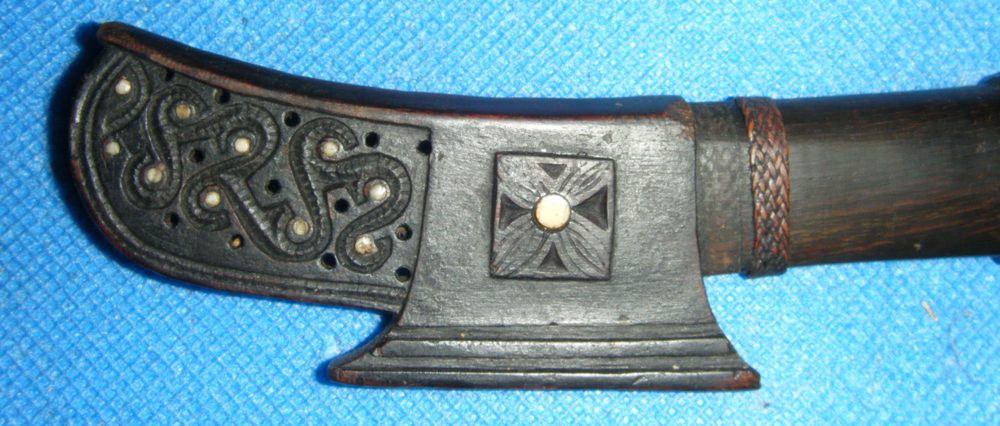 Here another specimen, quite elaborated Pamor, yet also kind of typical - a twisted rod (?) in the upper third, two twisted rods in the middle. Perhaps there was some different kind of a twisted rod at the edge, but it has vanished. Additionally a Batu Lapak, only on the "inner" side of blade.